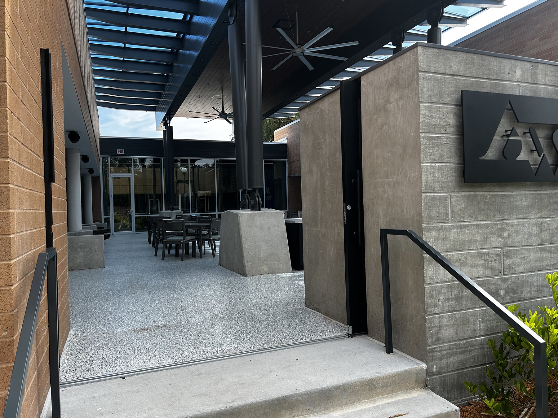 The system aligns with the project’s broader material language: exposed structure, durable components, and details that support the architecture without calling attention to themselves.