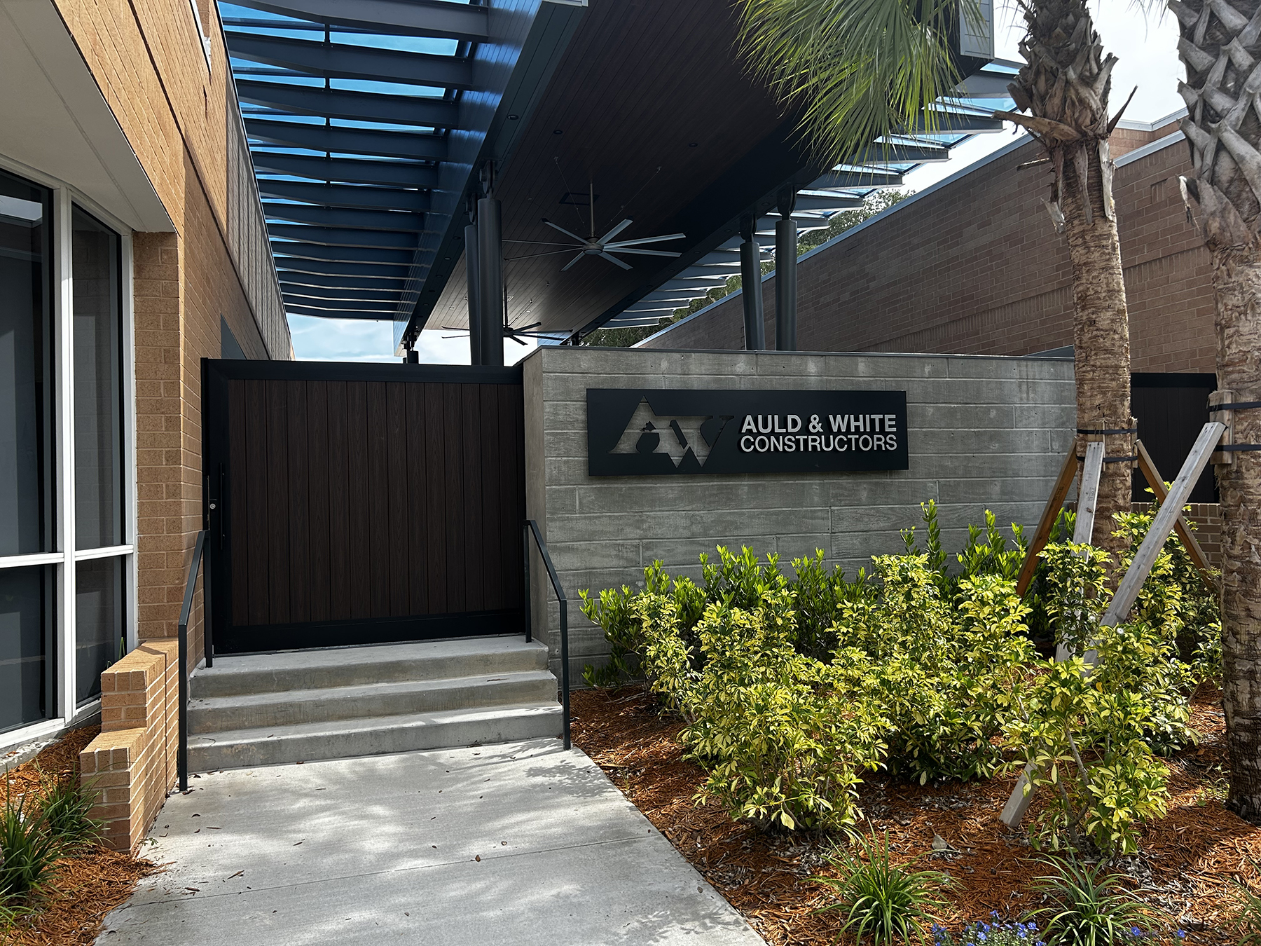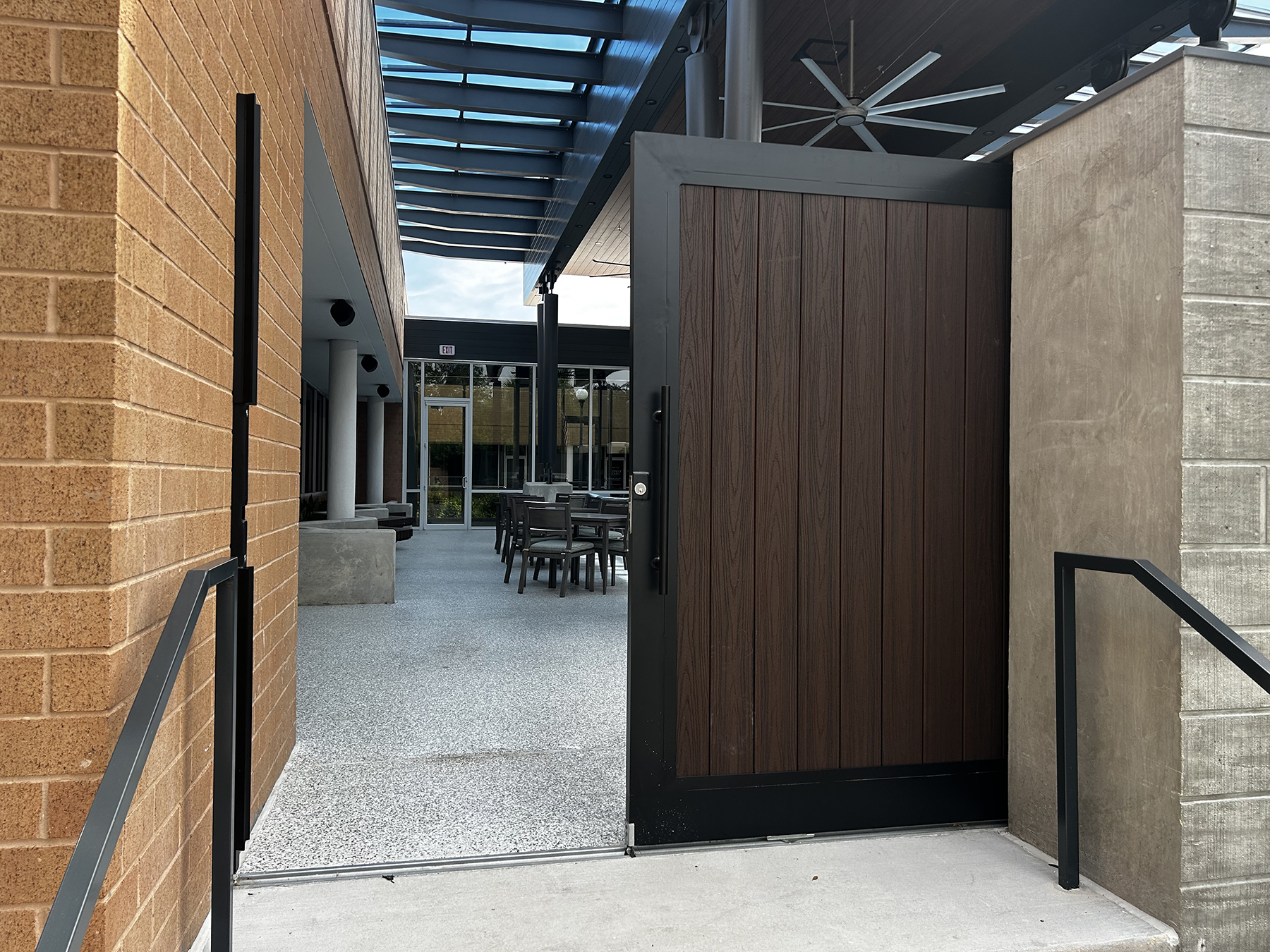At Auld & White Constructors’ new headquarters, flexibility was designed into the building from day one. In the central courtyard connecting the two-building campus, a pair of custom sliding pocket gates allows the space to transition easily between an open-air pass-through and an enclosed venue for meetings and events.