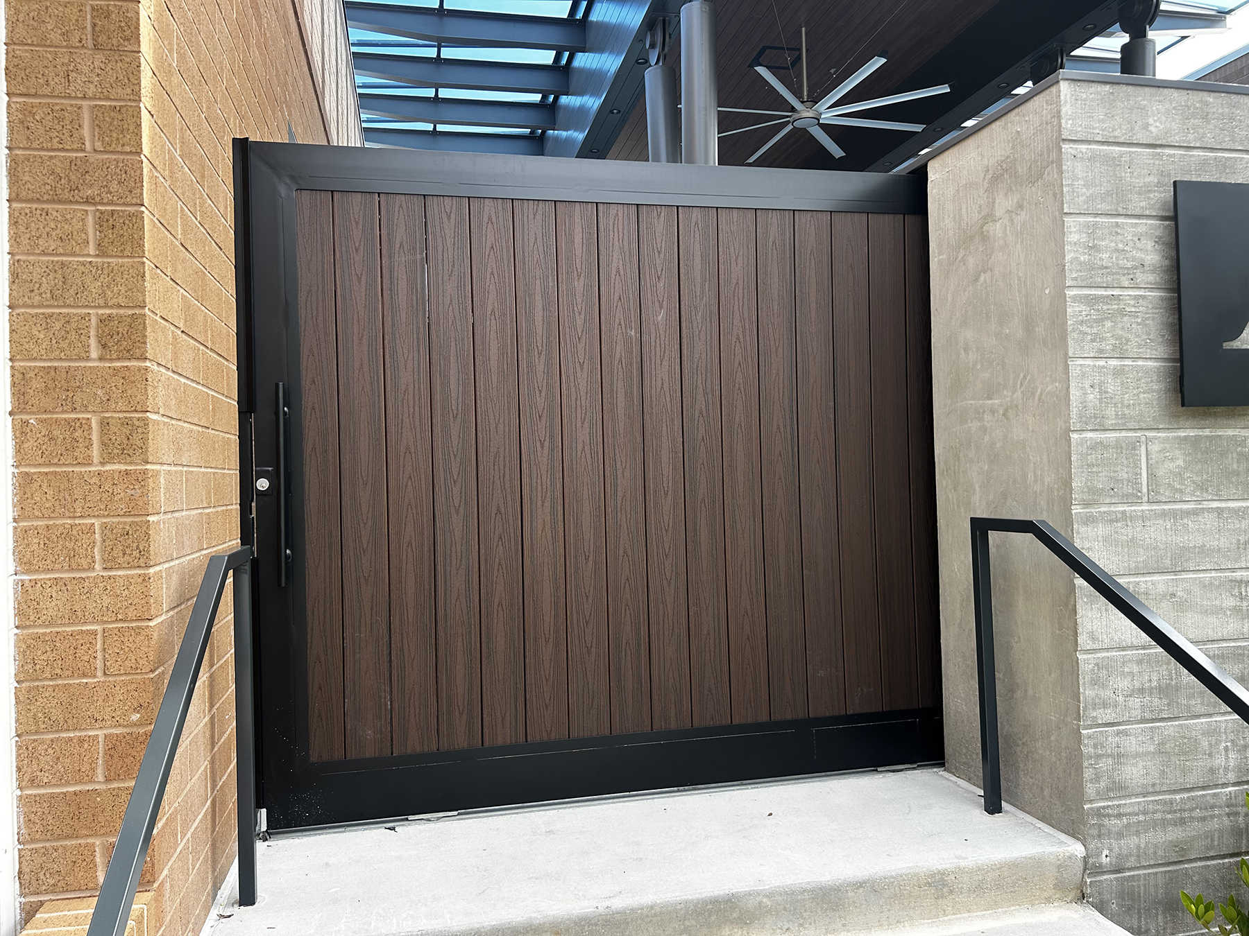 When open, the courtyard flows cleanly between buildings, reinforcing the campus-style layout. When closed, the gates define a sheltered, flexible space for company gatherings and events. Underfoot, the recessed track remains flush and unobtrusive—no visual clutter, no safety concerns.