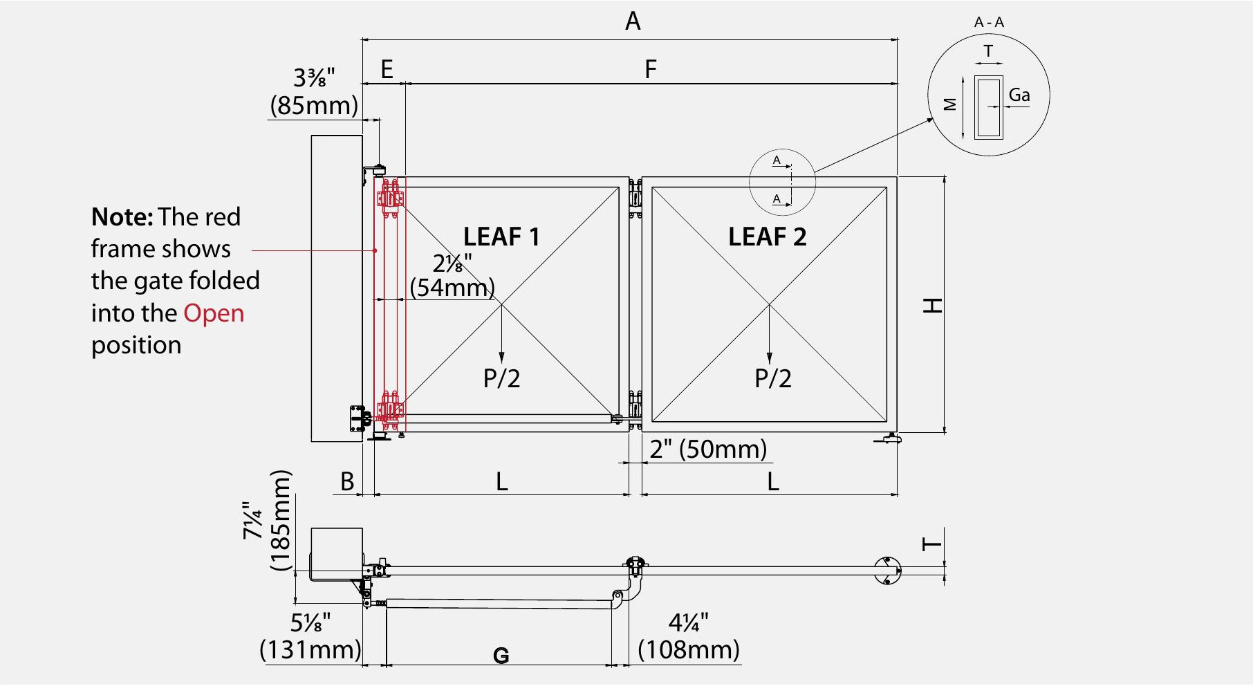 | E: Gate width in open position | E (in) = (2 x T) + B + 2-1/8" |