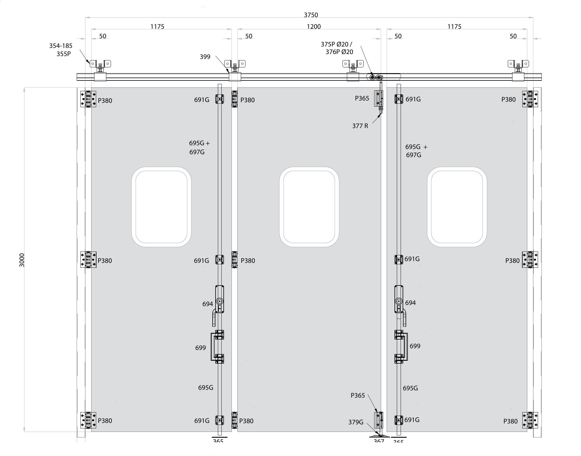Galvanized Trolley375-P20Small steel trolley with 4 wheels. 880 lbs. per trolley. Use with track 399. Requires M20 pin. |