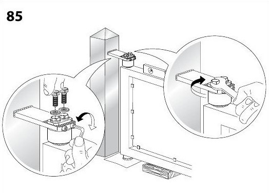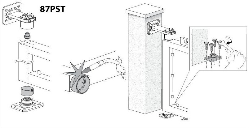 Adjustable upper hinge with plate to be screwed on and sealed bearings85PST-M3/8" thick mounting bracket 2" Hinge diameter 2-1/4" - 3-3/8" Adjustability Maximum Capacity 700 lbs |