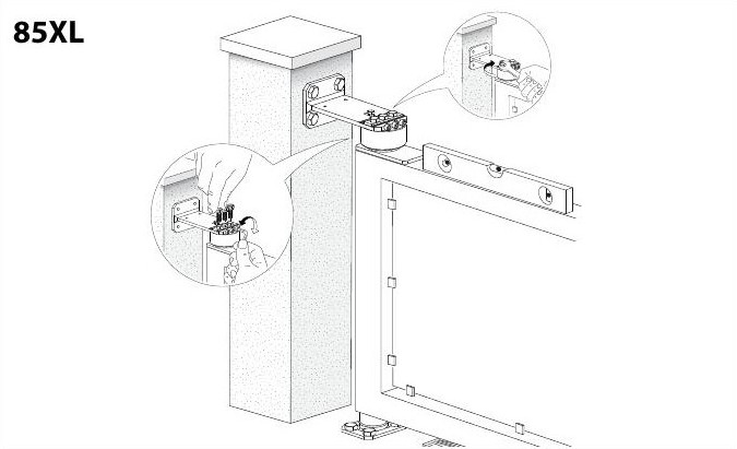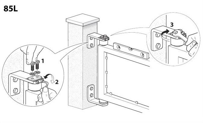 Adjustable upper hinge with L-Bracket to be screwed on and sealed bearings85L-M3/8" thick mounting bracket 2" Hinge diameter 2-1/4" - 3-3/8" Adjustability Maximum Capacity 770 lbs |