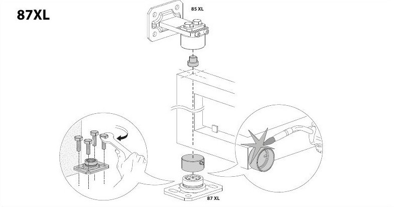 Double adjustable heavy duty upper hinge with sealed bearings and plate to be screwed on85XL1/2" thick mounting bracket 5" Hinge diameter 5-3/16" - 6-1/2" Adjustability Maximum Capacity 8800 lbs Suppllied with cover |