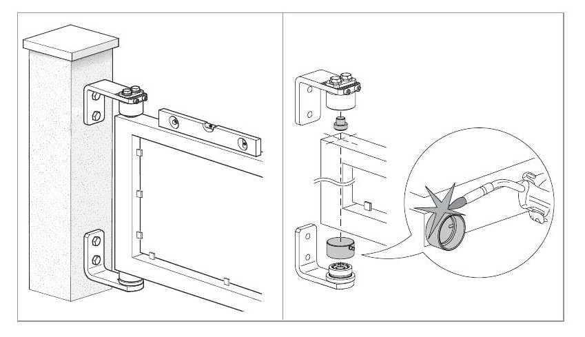Adjustable upper hinge with L-Bracket to be screwed on and sealed bearings85L-G3/8" thick mounting bracket 2-11/16" Hinge diameter 3-1/2" - 4-1/16" Adjustability Maximum Capacity 1100 lbs |