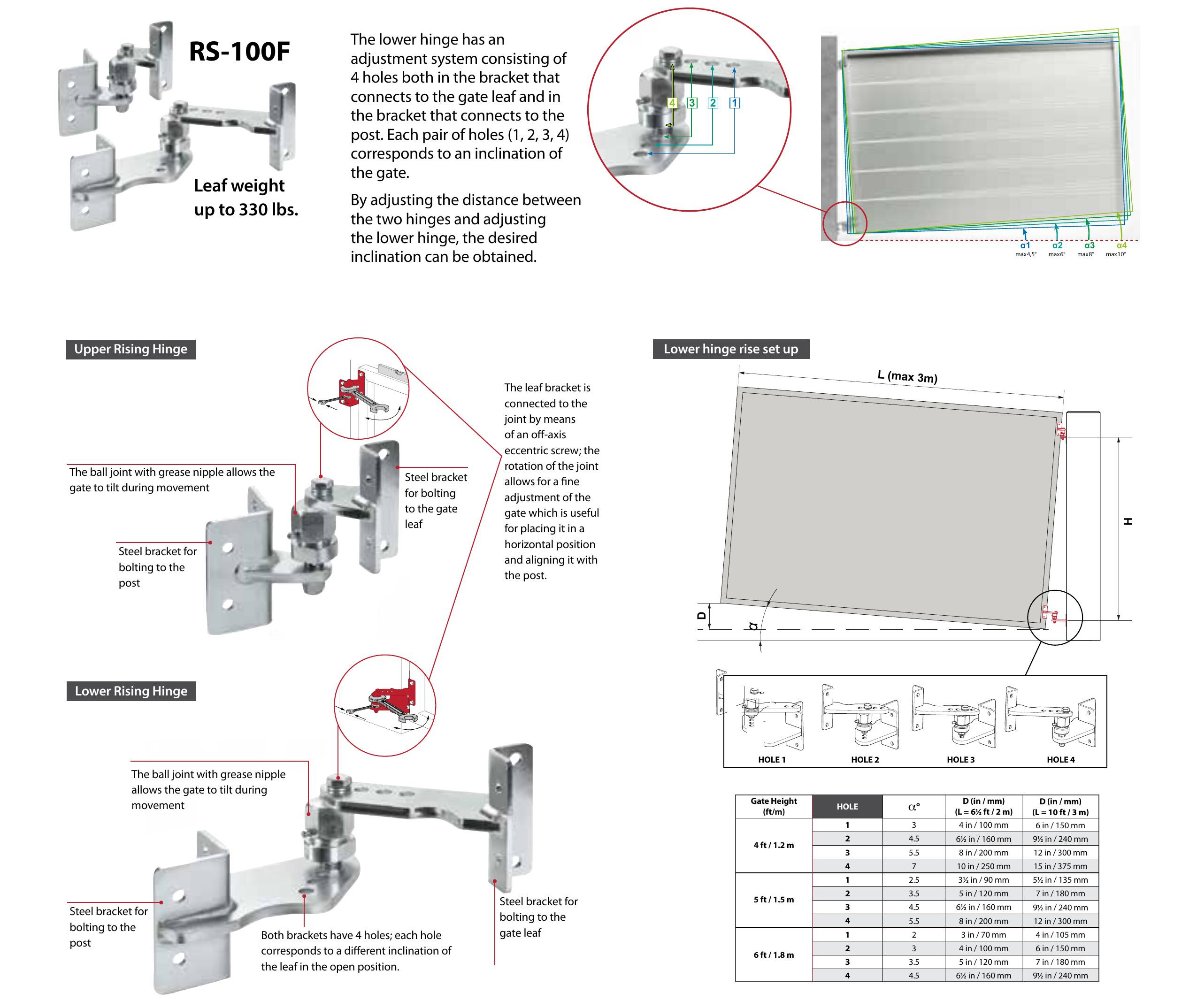 Rising hinge system for swing gates opening on an incline. Rising hinges is an innovative bolt-on gate hinge solution with 4 adjustable leaf inclination settings to match a slope of 4.5° up to 10°.